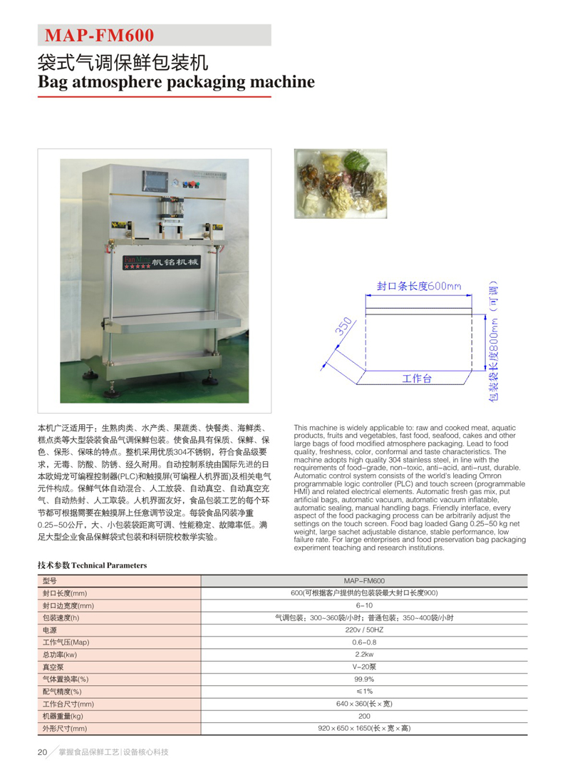 1.功能: 1) 本机适合各式食品的袋式包装,连续自动完成抽真空、自动混合保鲜气体(通常为CO2、N2、O2)、充气、封口包装等步骤。 2) 可完成PE、PP、PS等不同材质的包装袋进行封口包装。 3) 控制部件采用 可编程序控制器配合触摸屏实现人机界面对话 ,各部分动作及控制参数均可由触摸屏设定、修改。控制方便可靠,准确灵活,故障率低;包装过程自动化程度高,包装成品率高。 4) 抽真空、充气和时间等参数可以有效控制,确保产成品袋内保鲜气体精度和封口达到理想效果。
